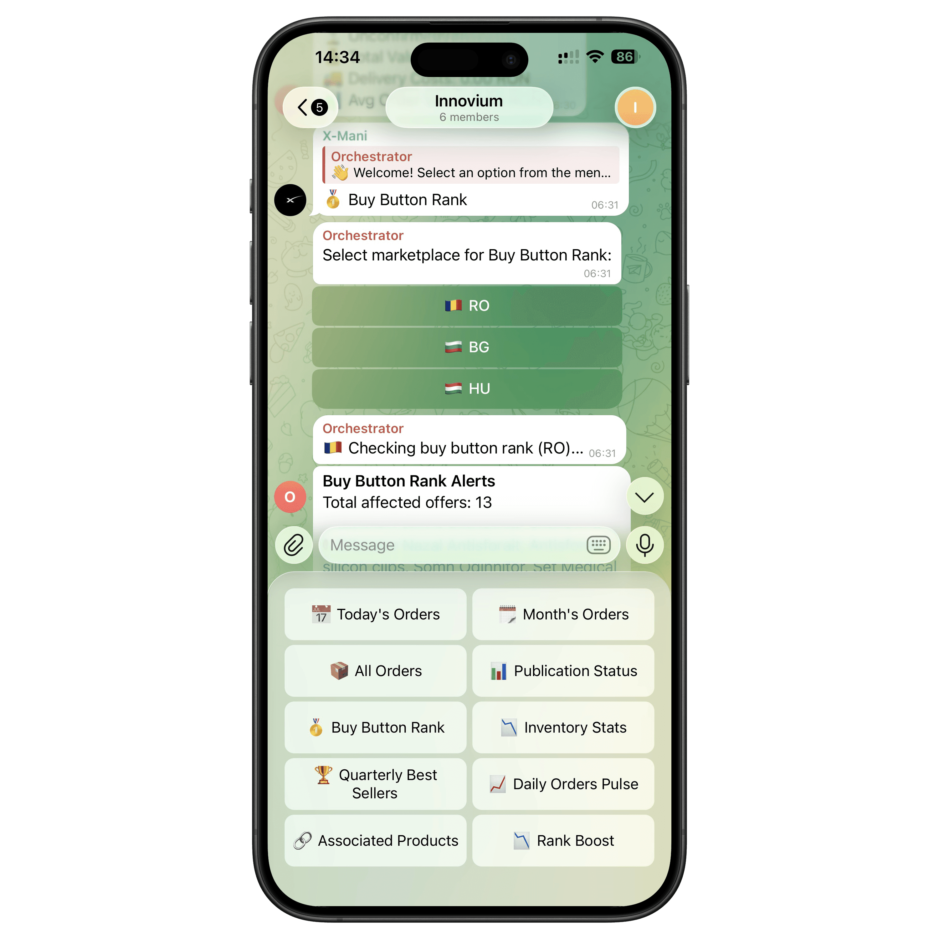 We built the Orchestrator: a backend system that connects the marketplace API, Baselinker order management, and Telegram into a single operational interface. The operator manages all three countries from one Telegram conversation. No portals, no dashboards, no spreadsheets.